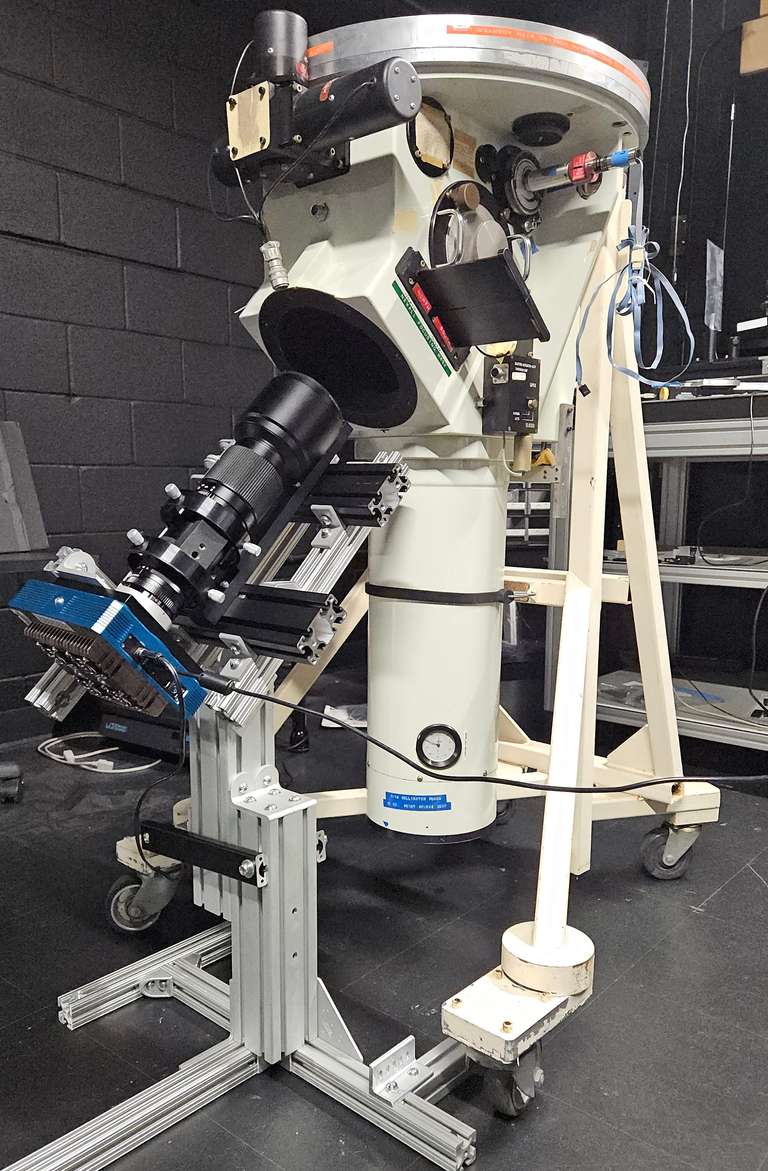 For testing in the lab, an APOGEE Alta F15M with a 500mm lens gathers the light from the spectrograph output. A mount on top of the spectrograph shines light from a fiber bundle through the slit.